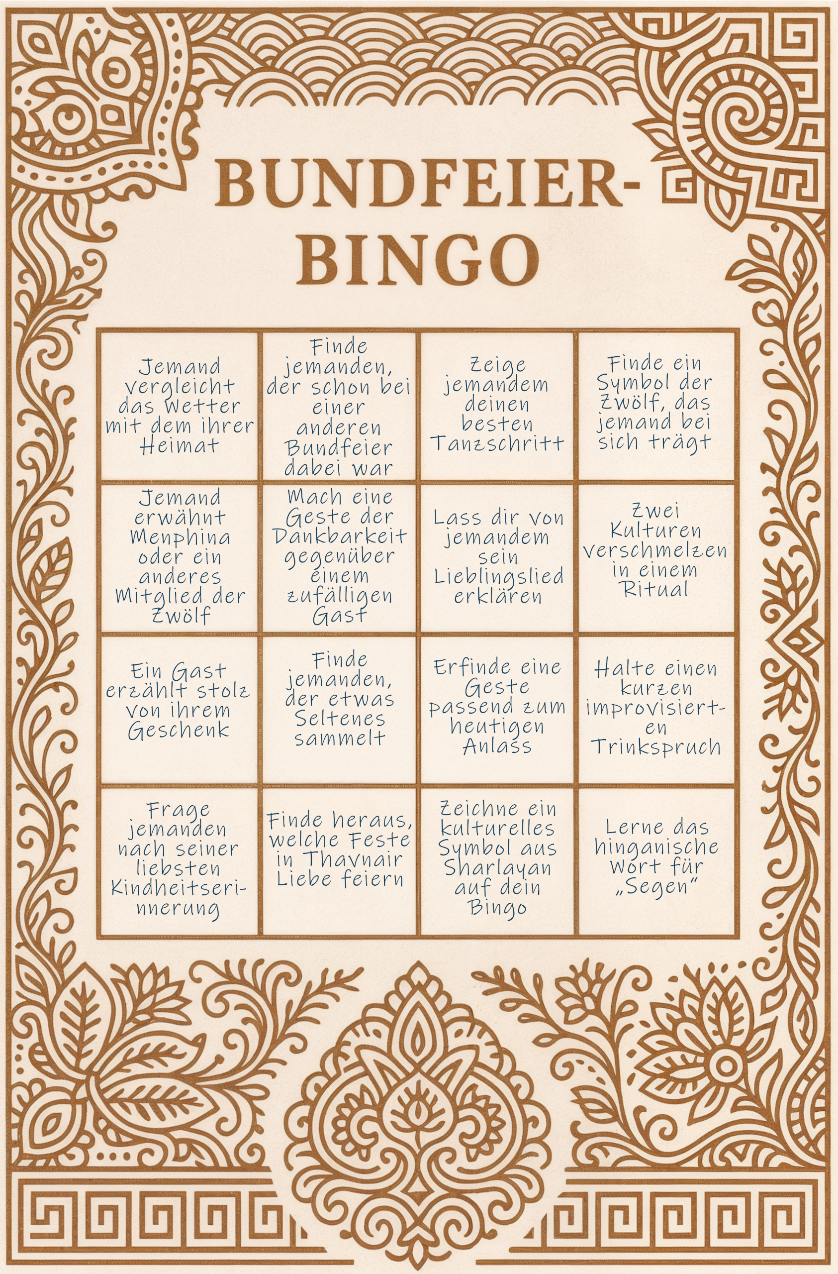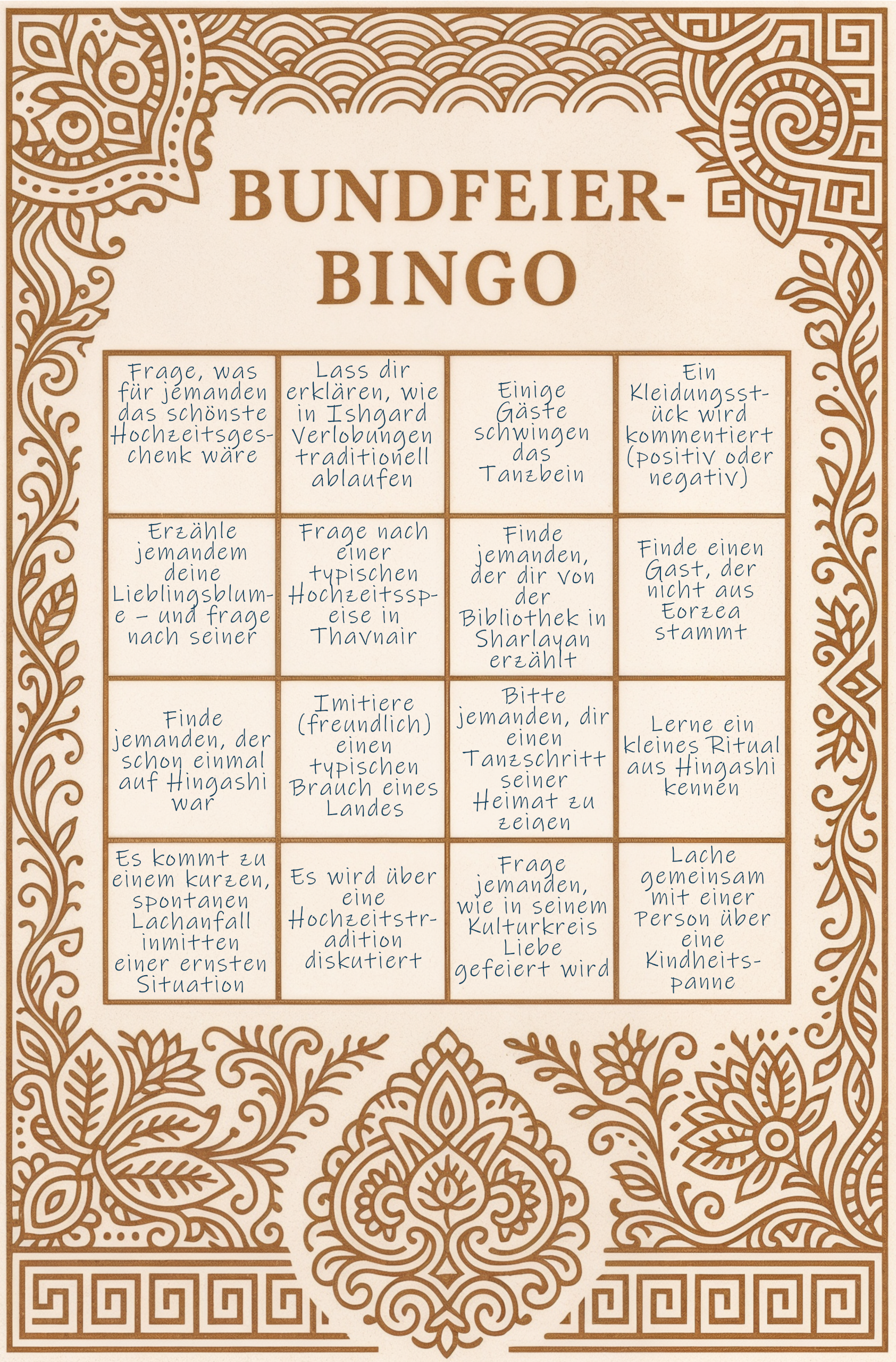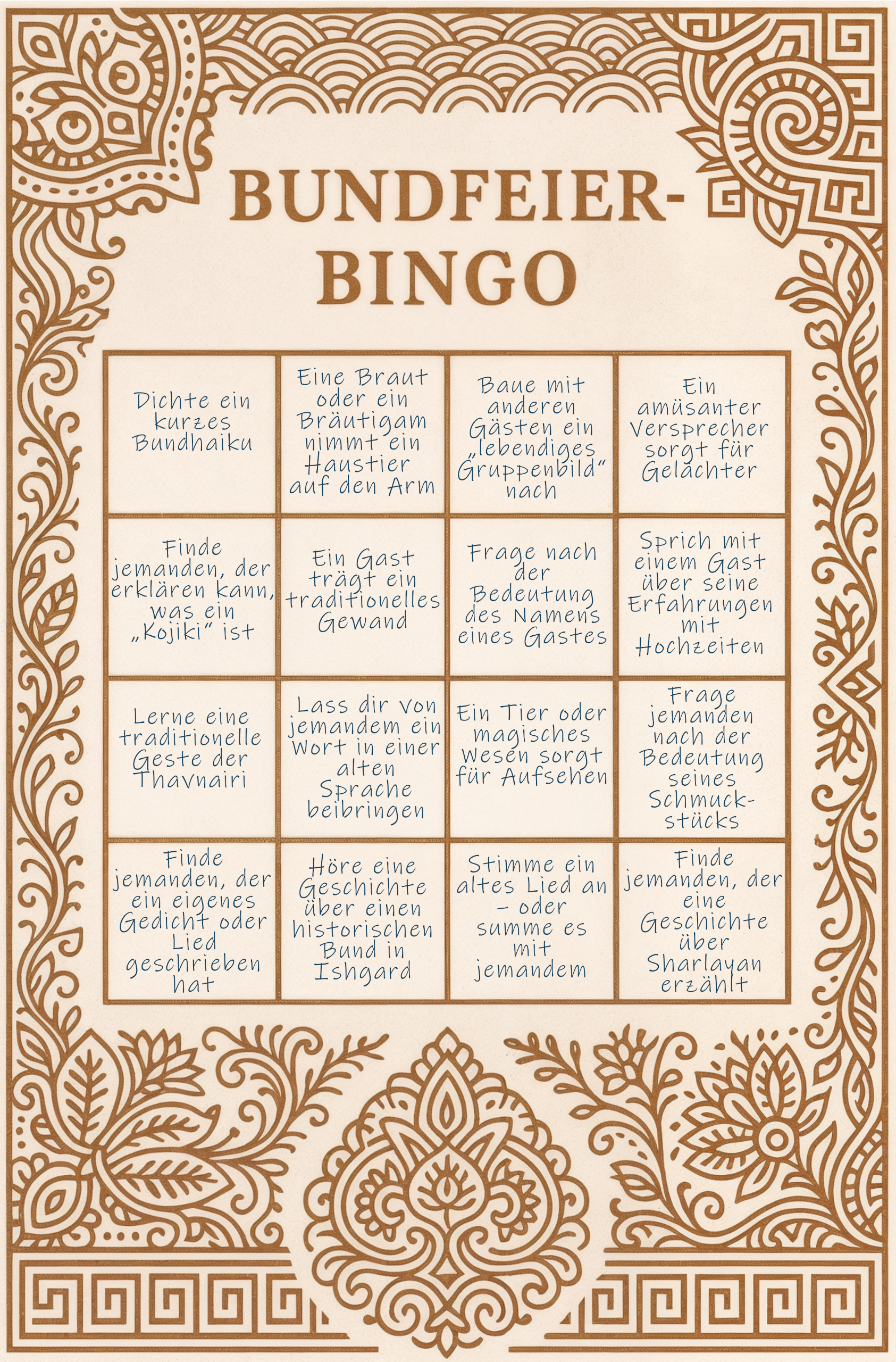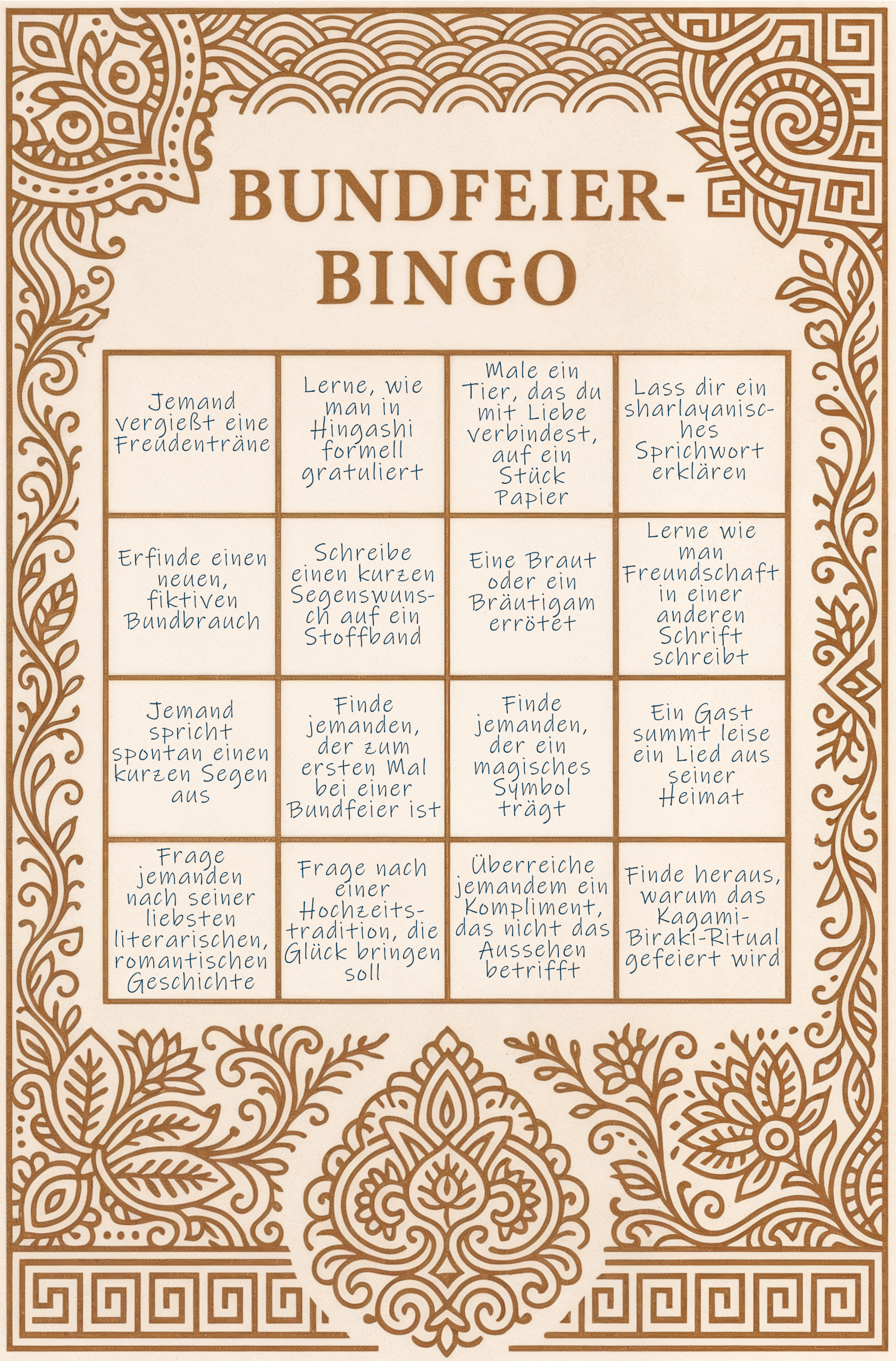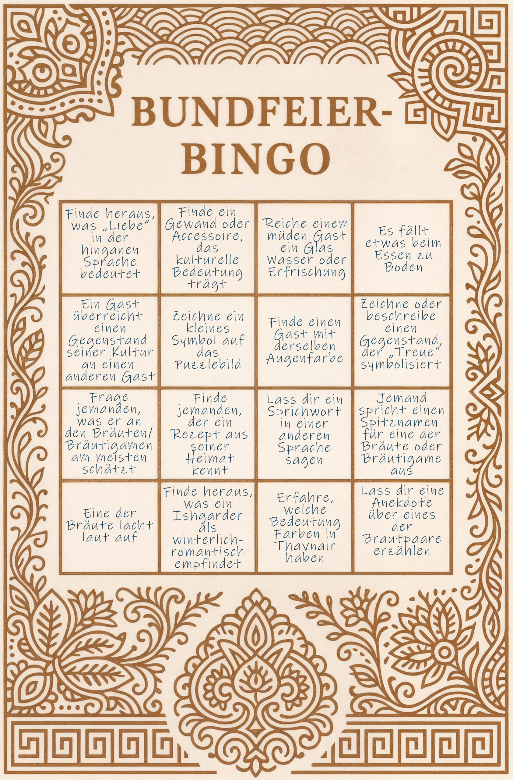 Das Bundbingo kombiniert typische Momente der Feier mit kulturellen Einblicken und einer kleinen Gästesuche. Jede Karte (wird den Gästen mittels eines gewhisperten Link zugeschickt) besteht aus einem 4x4-Felder-Raster, das während des Abends nach und nach gefüllt werden kann. So kommen die Gäste spielerisch ins Gespräch und erleben die Feier auf eine interaktive Weise.Die fünf zur Verfügung stehenden Karten: