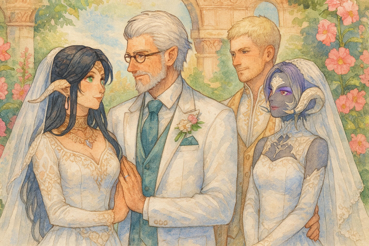 Die Villa Dünenblick erhebt sich in der Marmorgasse 42 von Ul’dah (nicht der Kelchkuppe), in einem der vornehmeren Stadtviertel. Saubere Gassen und regelmäßige Patrouillen der Legion unterstreichen den gepflegten Charakter der Umgebung. Von hier aus reicht der Blick hinüber in das benachbarte Viertel „Die Dünen“, das für seine geschäftigen Läden, fleißigen Handwerker und die berüchtigten Kissenhäuser bekannt ist.Im Erdgeschoss der Villa können Gäste an der Theke auf dem Podest Speisen und Getränke erhalten oder sich von den umhergehenden Kellnerinnen bedienen lassen. Sitzgelegenheiten finden sich sowohl im Foyer und im Innenhof des Erdgeschosses, dem Gewölbe im Keller, als auch auf der Dachterrasse im Obergeschoss. Für diesen Anlass wurde das Atelier zum Schauplatz des Brautpaarspiels umgestaltet. An der Treppe zum Obergeschoss wartet zudem ein kleiner Tisch mit der Kurkuma-Henna-Farbe, eigens für das Haldi-Spiel bereitgestellt, während die bemalbare Wand sowie ein Gabentisch für Geschenke im Gewölbe des Kellergeschosses Platz gefunden hat.