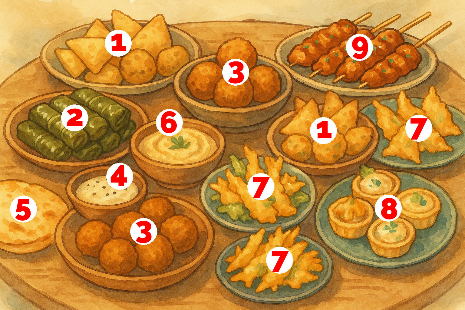 | Mini-Samosas & Pakoras (1) mit Chutney-Dips Knusprige Teigtaschen und frittierte Gemüsestückchen, serviert mit würzigen Saucen |
